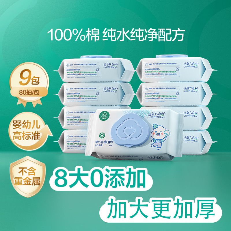 【囤货装】9包80抽全棉时代婴儿湿巾宝宝100%棉湿巾手口可用带盖